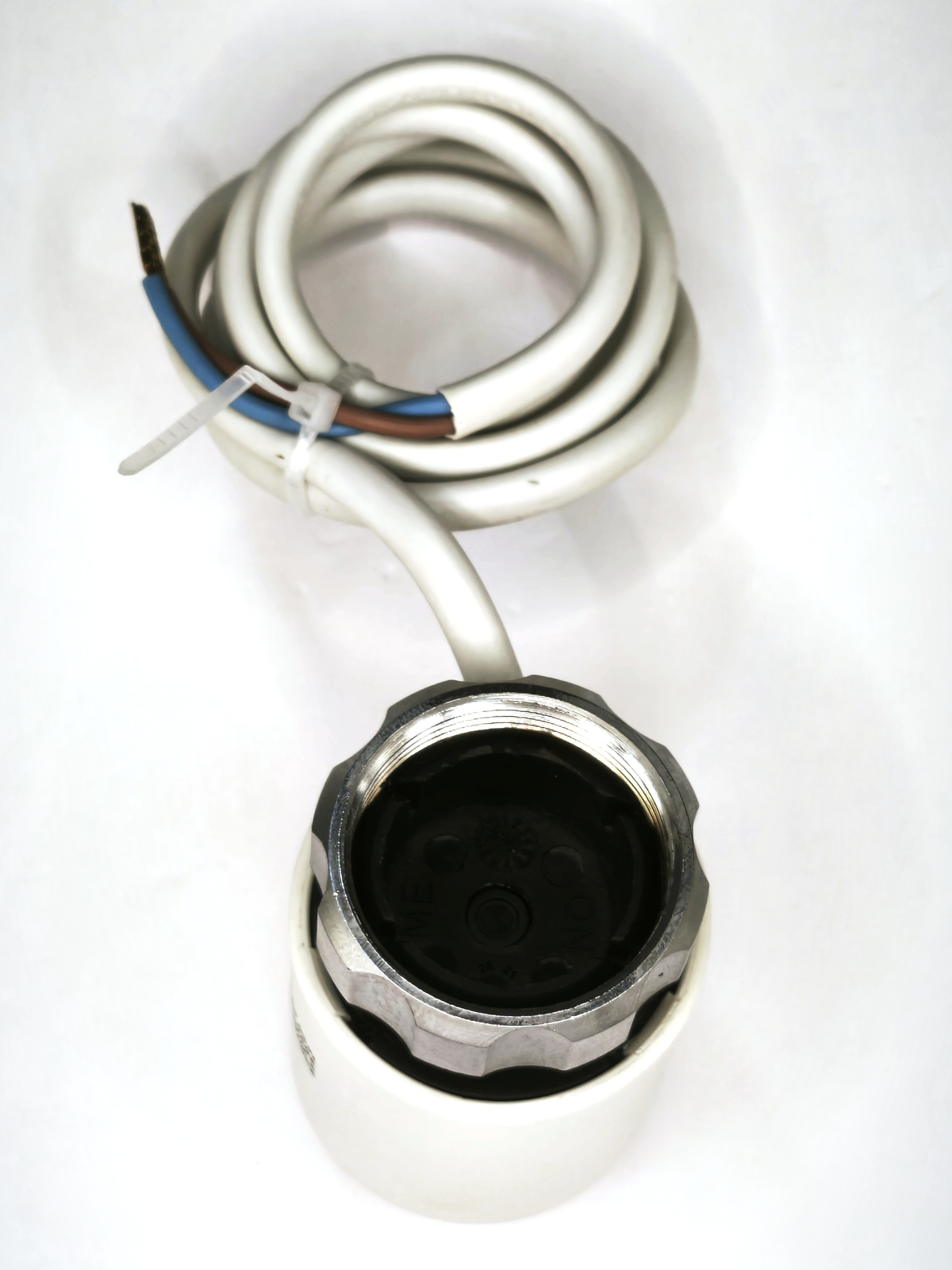Actuator conectat la circuitul de distributie cu agent termic, utilizat in instalatiie de incalzire, inainte de instalare, actuatorul este in pozitia normal deschis, iar dupa ce se monteaza se apasa pe el si devine normal inchis.