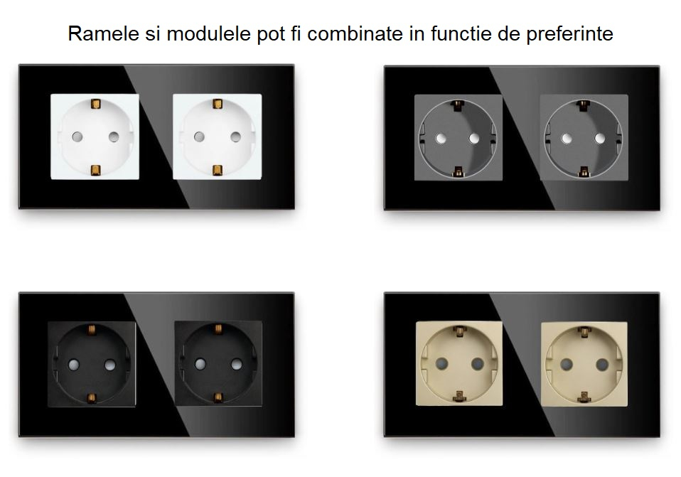 Panouri care se potrivesc pentru 2 doze clasice inseriate. Aveti posibilitatea de a va configura singur panoul dupa bunul plac si dupa necesitate. Alegeti modului pe care il doriti pentru doza din stanga iar apoi pentru doza din dreapta. Fotografiile sunt doar ca model de prezentare, nu corespund cu alegerile facute de catre dumneavoastra.